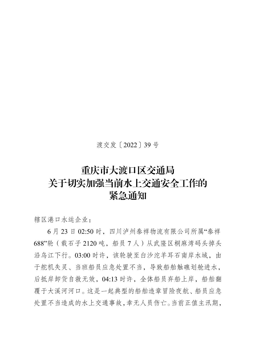 重庆市大渡口区交通局关于切实加强当前水上交通安全工作的紧急通知