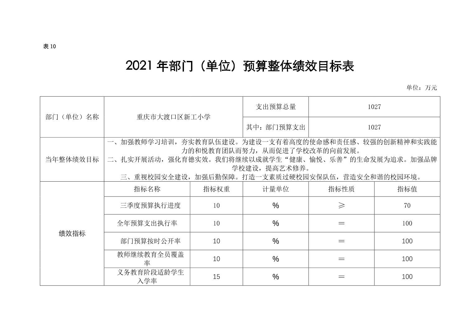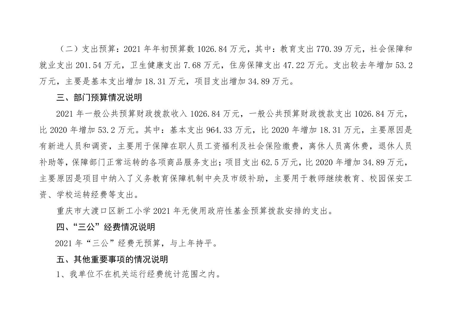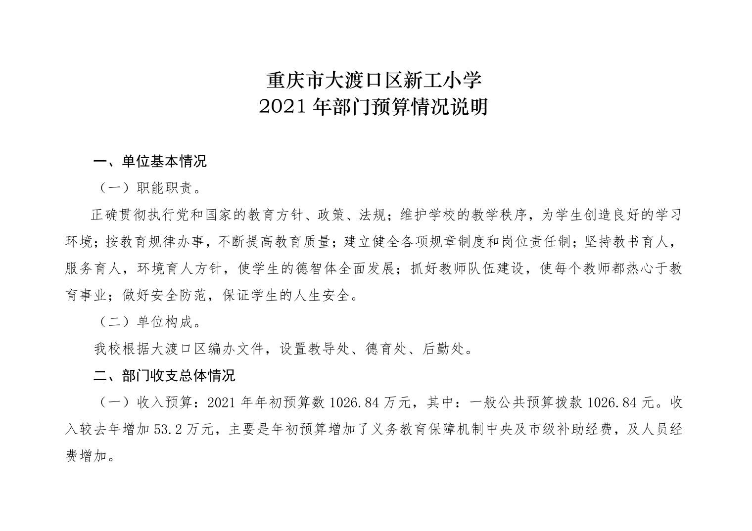 重庆市大渡口区新工小学2021年部门预算情况说明