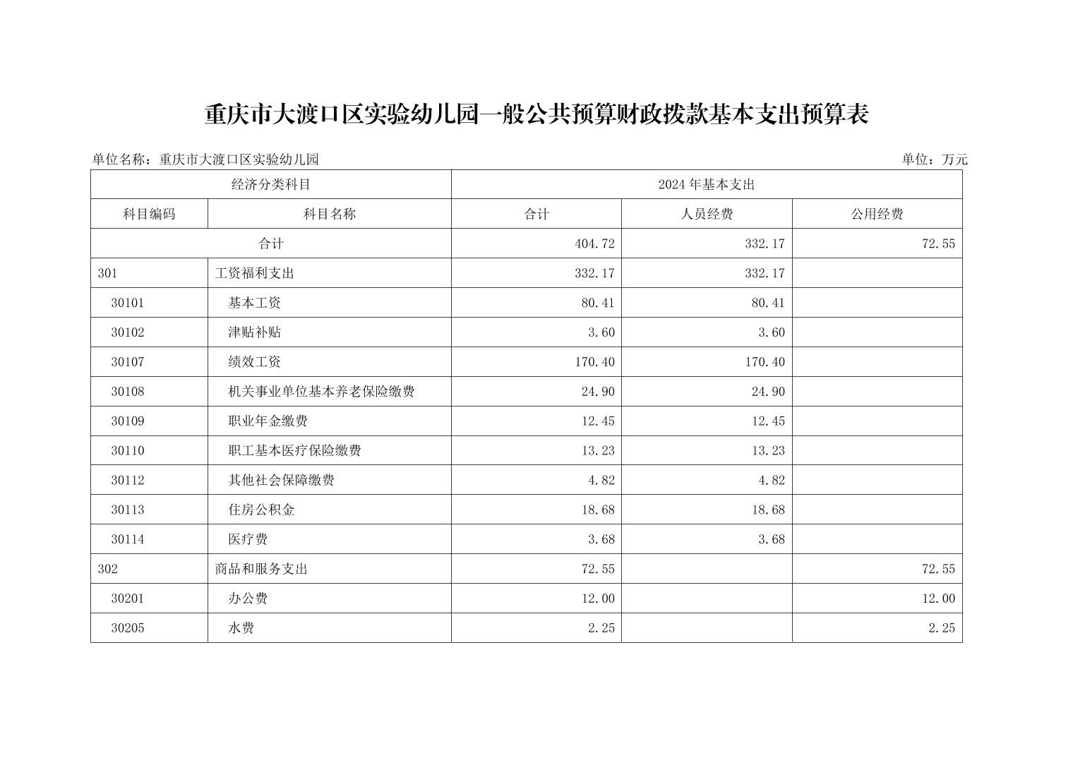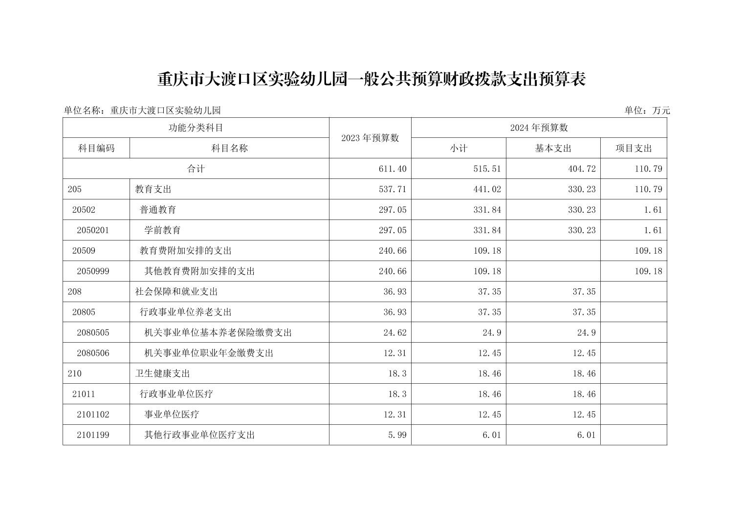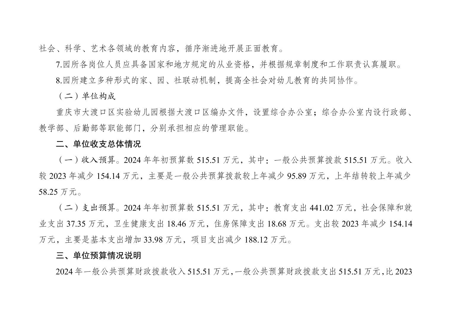 重庆市大渡口区实验幼儿园2024年单位预算情况说明