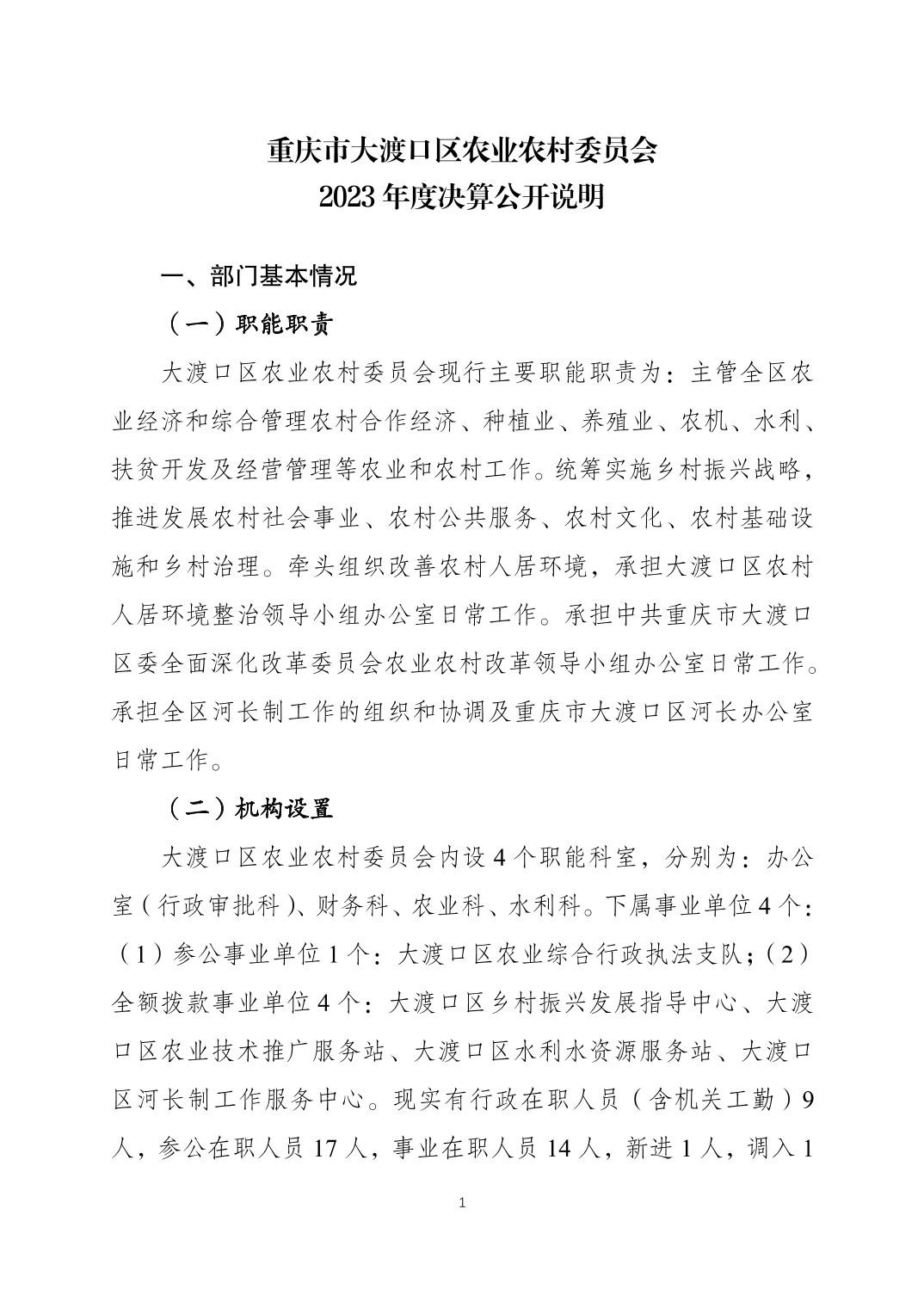 重庆市大渡口区农业农村委员会2023年度决算公开说明