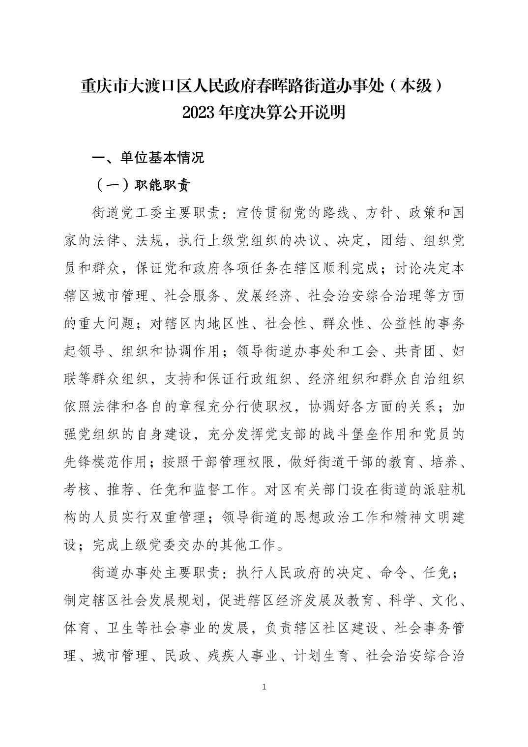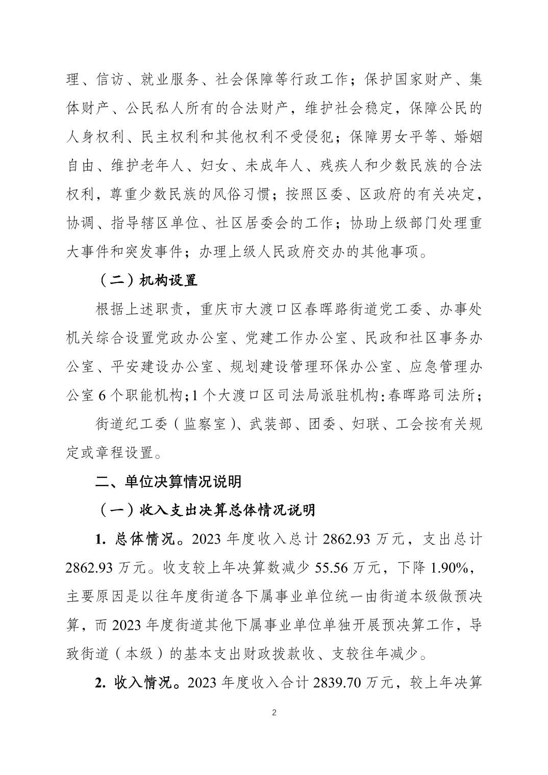 重庆市大渡口区春晖路街道办事处(本级) 2023 年度决算公开说明