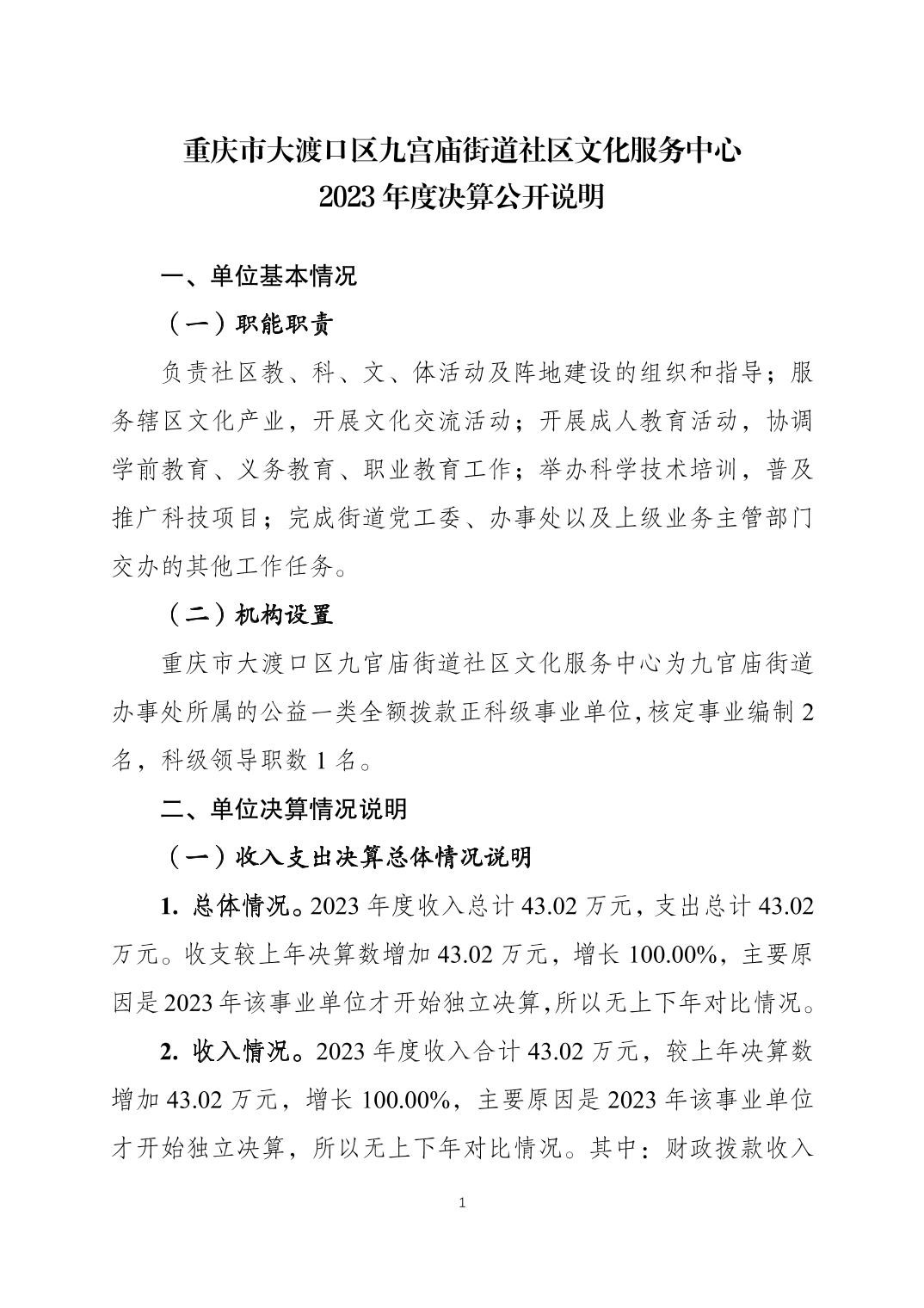 重庆市大渡口区九宫庙街道社区文化服务中心 2023 年度决算公开说明